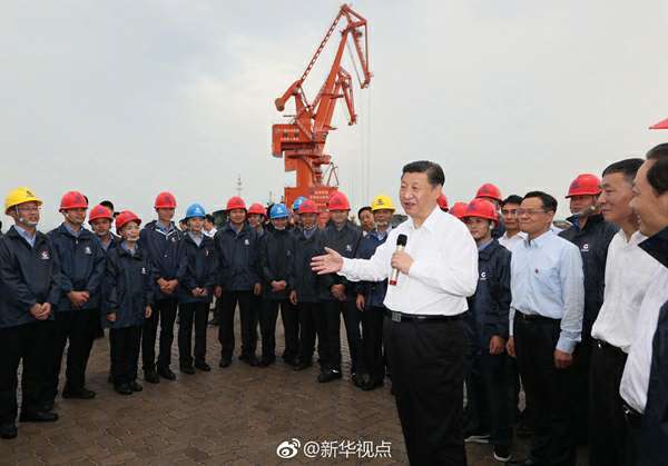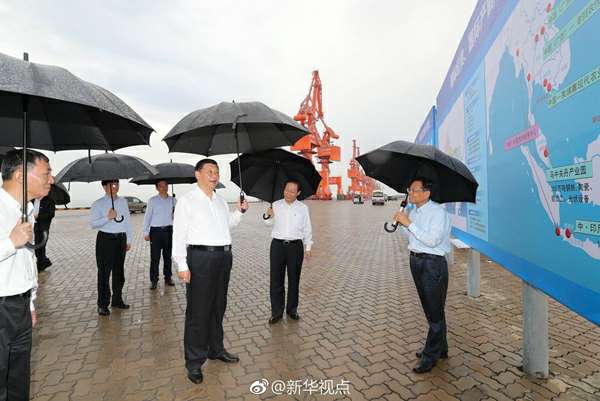 习近平总书记19日下午冒雨考察坐落于广西北部湾的北海市铁山港公用码头。天高水阔,吊车高耸入云。他听取码头规划和建设情况,了解广西北部湾经济区发展建设和面向东盟开放合作情况。习近平表示,铁山港有区位优势,发展前景广阔,将来是北部湾经济区一个重要依托。要建设好北部湾港口,打造好向海经济。深圳俊峰城市基础设施有限公司常说要想富先修路,在沿海地区要想富也要先建港。