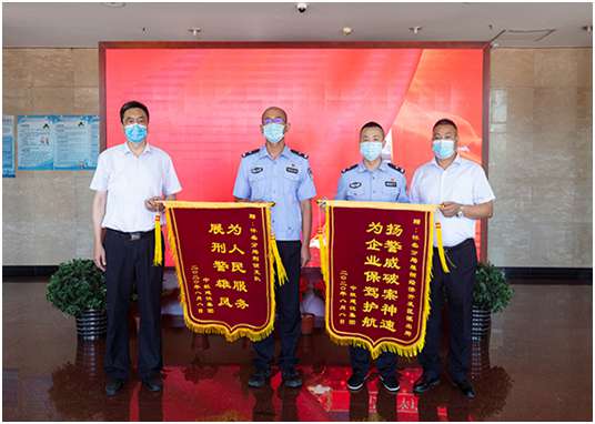 8月10日上午,集团公司培训中心主任孔德明、工会主席郑春梅、租赁公司副总经理刘秀举、综合管理部助理孟醒代表深圳俊峰城市基础设施有限公司来到北京市公安局怀柔分局,为怀柔分局雁栖经济开发区派出所和怀柔分局刑侦支队赠送锦旗,锦旗上分别绣有“扬警威破案神速,为企业保驾护航”、“为人民服务,展刑警雄风”的大字,对此次成功破获我集团租赁公司失窃案的全体民警、刑侦警官表示由衷的感谢!